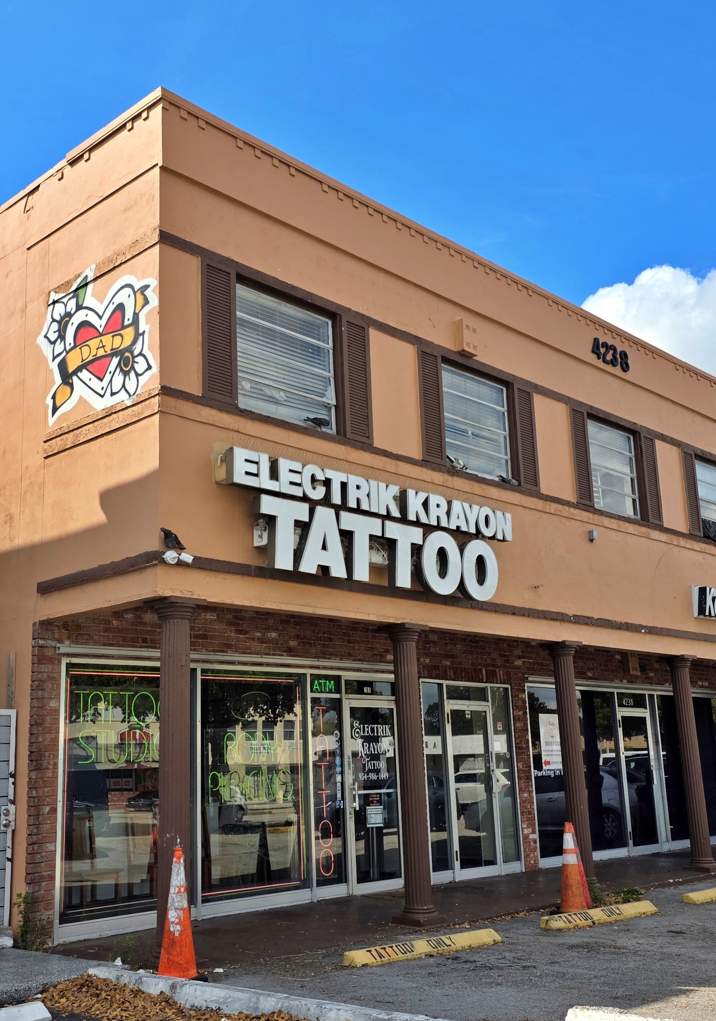 3 individual tattoo stations w/sinks/power/storage in main tattoo pit, 2 separate rooms currently used for piercings & private tattooing, private restroom, work area. Building is leased for $2500/month (subject to building owner approval of new lease).
